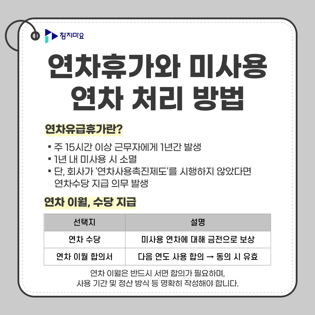 - 단, 회사가 '연차사용촉진제도'를 시행하지 않았다면 연차수당 지급 의무 발생